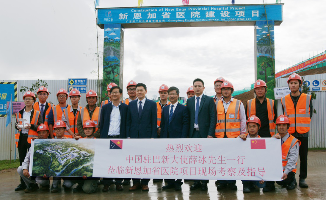 2020年1月10日,巴布亚新几内亚(以下简称巴新)新总理马拉佩(James Marape)夫妇会同中国驻巴新大使薛冰,在巴新渔业及海事资源部长Dr Lino Tom、巴新工商部长William Duma和恩加省省长Peter Ipatas等巴新政要的陪同下,共同视察指导了我司承建的新恩加省医院建设项目,并看望慰问现场的中、巴两国工人。